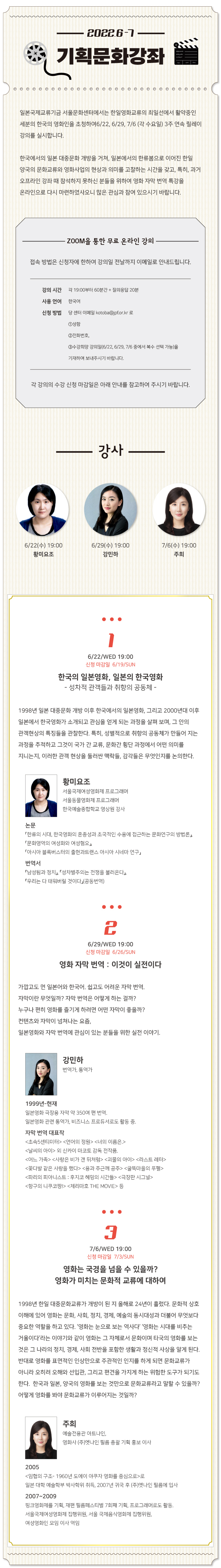 일본국제교류기금 서울문화센터에서는 한일영화교류의 최일선에서 활약중인 세분의 한국의 영화인을 초청하여6/22, 6/29, 7/7 (각 수요일) 3주 연속 릴레이 강의를 실시합니다.