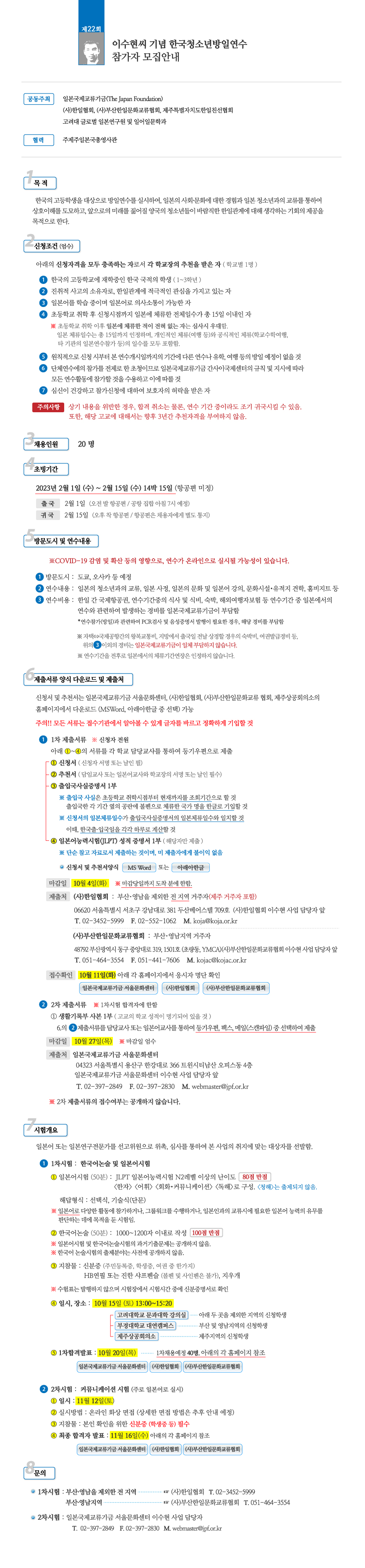 인명구조를 위해 국경을 초월한 인간애를 발휘한 의인 이수현 씨의 용기있는 행동을 기리기 위해, 한국의 청소년을 대상으로 방일연수를 실시하고 있습니다.