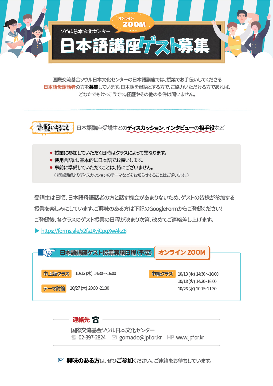 国際交流基金ソウル日本文化センターの日本語講座では、授業でお手伝いしてくださる日本語母語話者の方を募集しています。日本語を母語とする方で、ご協力いただける方であれば、どなたでもけっこうです。経歴やその他の条件は問いません。
