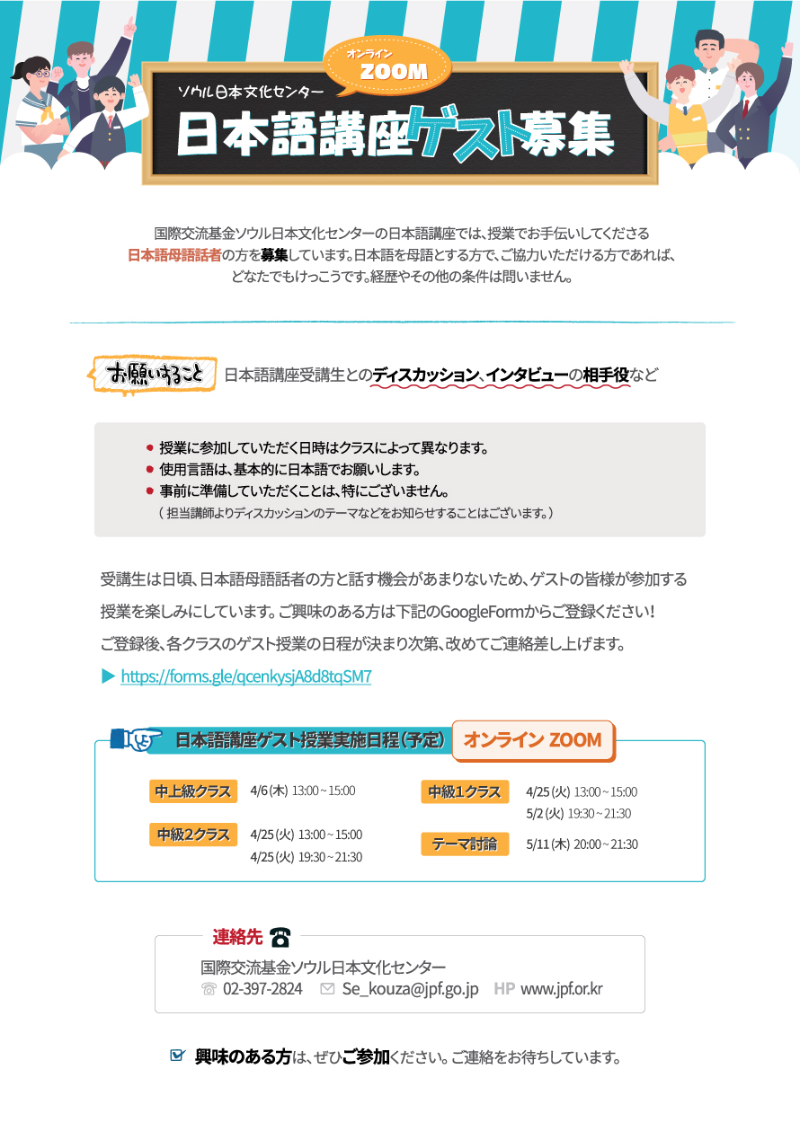 国際交流基金ソウル日本文化センターの日本語講座では、授業でお手伝いしてくださる日本語母語話者の方を募集しています。日本語を母語とする方で、ご協力いただける方であれば、どなたでもけっこうです。経歴やその他の条件は問いません。