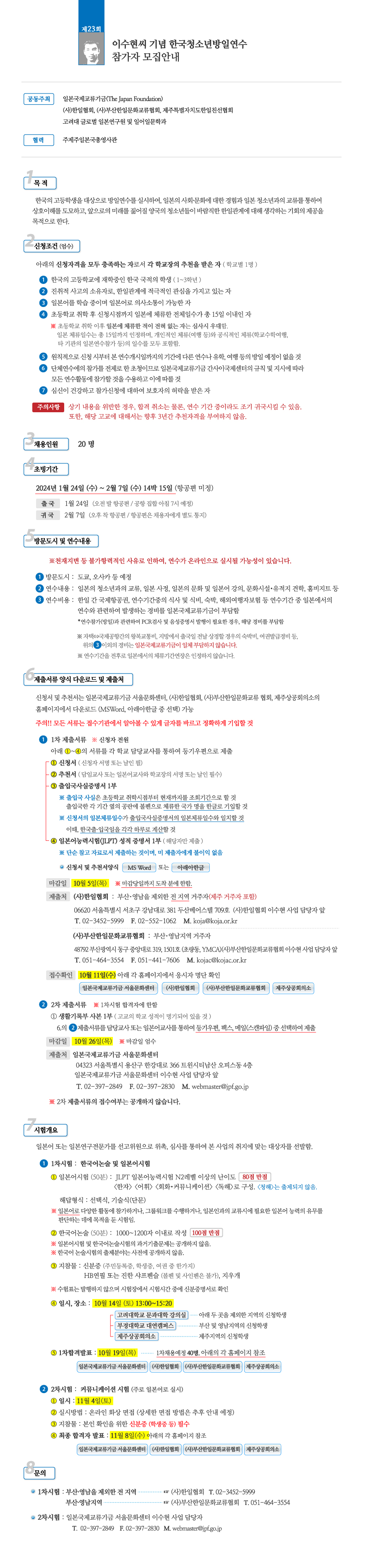 인명구조를 위해 국경을 초월한 인간애를 발휘한 의인 이수현 씨의 용기있는 행동을 기리기 위해, 한국의 청소년을 대상으로 방일연수를 실시하고 있습니다.