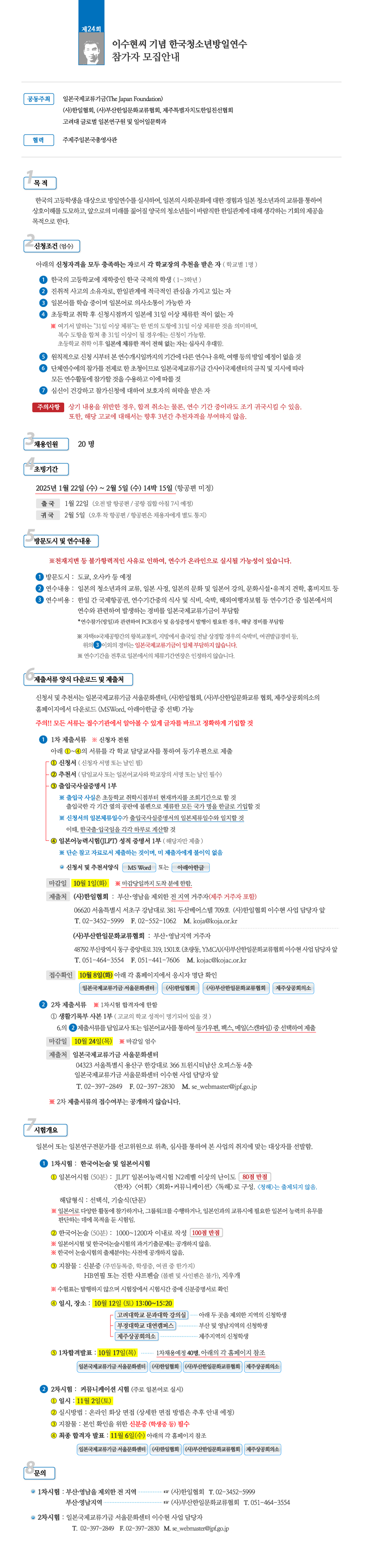 인명구조를 위해 국경을 초월한 인간애를 발휘한 의인 이수현 씨의 용기있는 행동을 기리기 위해, 한국의 청소년을 대상으로 방일연수를 실시하고 있습니다.