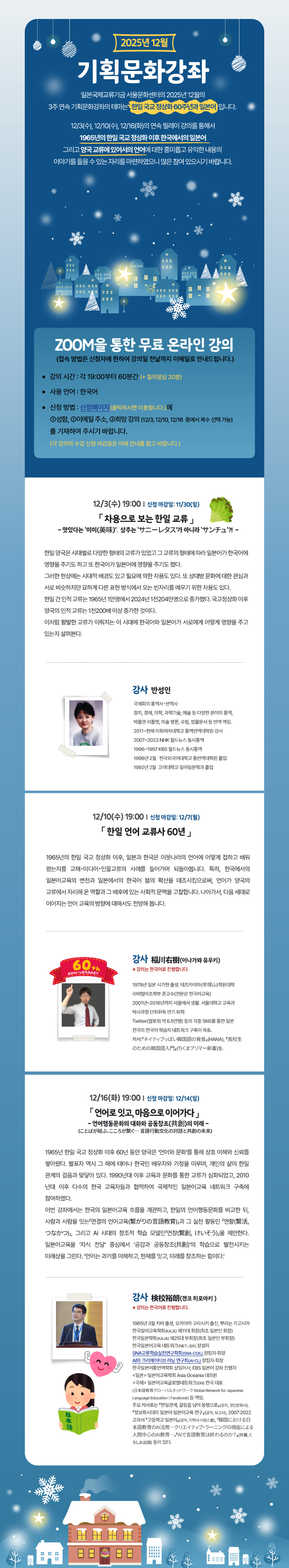일본국제교류기금 서울문화센터의 2025년 12월의 3주 연속 기획문화강좌의 테마는 <한일 국교 정상화 60주년과 일본어> 입니다.