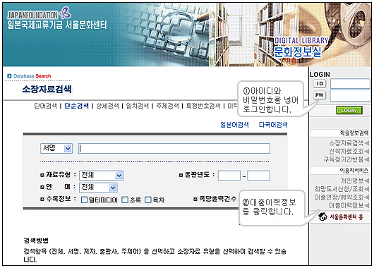 도서검색창(http://lib.jpf.or.kr)에서 자신의 회원번호(아이디)로 로그온 한 후,