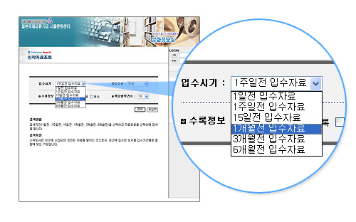 3. 아래와 같이 입수시기와 자료유형을 지정해 줍니다. 입수시기는 1일전부터 6개월전까지 보실 수 있으며 여기서는 저희 도서관에 1개월 전에 들어온 자료를 보기 위해 '1개월전 입수자료'를 선택합니다.