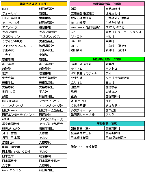 본 센터 문화정보실에서는 2005년 4월부터 2006년 3월까지 다음의 잡지(46종)와 신문(3종)을 구독하게 되었습니다. 이용자 여러분들의 이용빈도와 예산, 주제별 배분 등을 고려하여 결정되었으니, 여러분들의 이해와 많은 이용 부탁 드립니다.