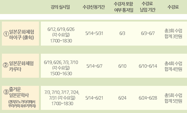 이번에 실시하게 된 코스는, <하이쿠(俳句) >, <카루타>, <즐거운 일본문학사 (겐지모노가타리(源氏物語) 에서 무라카미 하루키까지)> 입니다. 각각의 코스에 대한 수강신청 방법은 아래 내용을 참조하여 주시기 바랍니다.