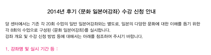 *이번 강좌는 수료제도는 실시하지 않으므로, 기존의 일반 일본어강좌 수료자에게 부여하고 있는 다음 학기 수강 신청 우선권 등은 부여하지 않습니다.