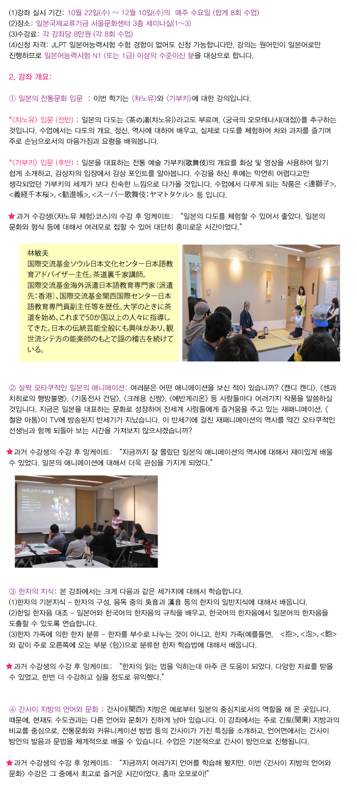 *각 강좌의 내용은 과거에 실시한 내용과 동일합니다. (단, <일본의 전통문화 입문>은 신규 개설)