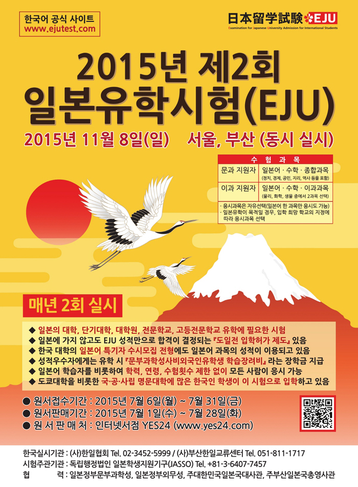 사단법인 한일협회가 주최하는 2015년 제2회 일본유학시험(EJU) 접수가 7월6일부터 7월31일까지 실시됩니다.