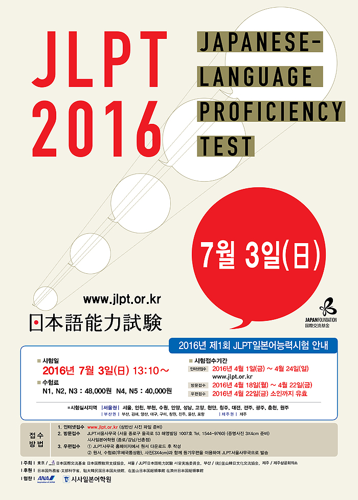 2016년 제1회 JLPT 일본어능력시험의 일정이 아래와 같이 결정되었습니다.