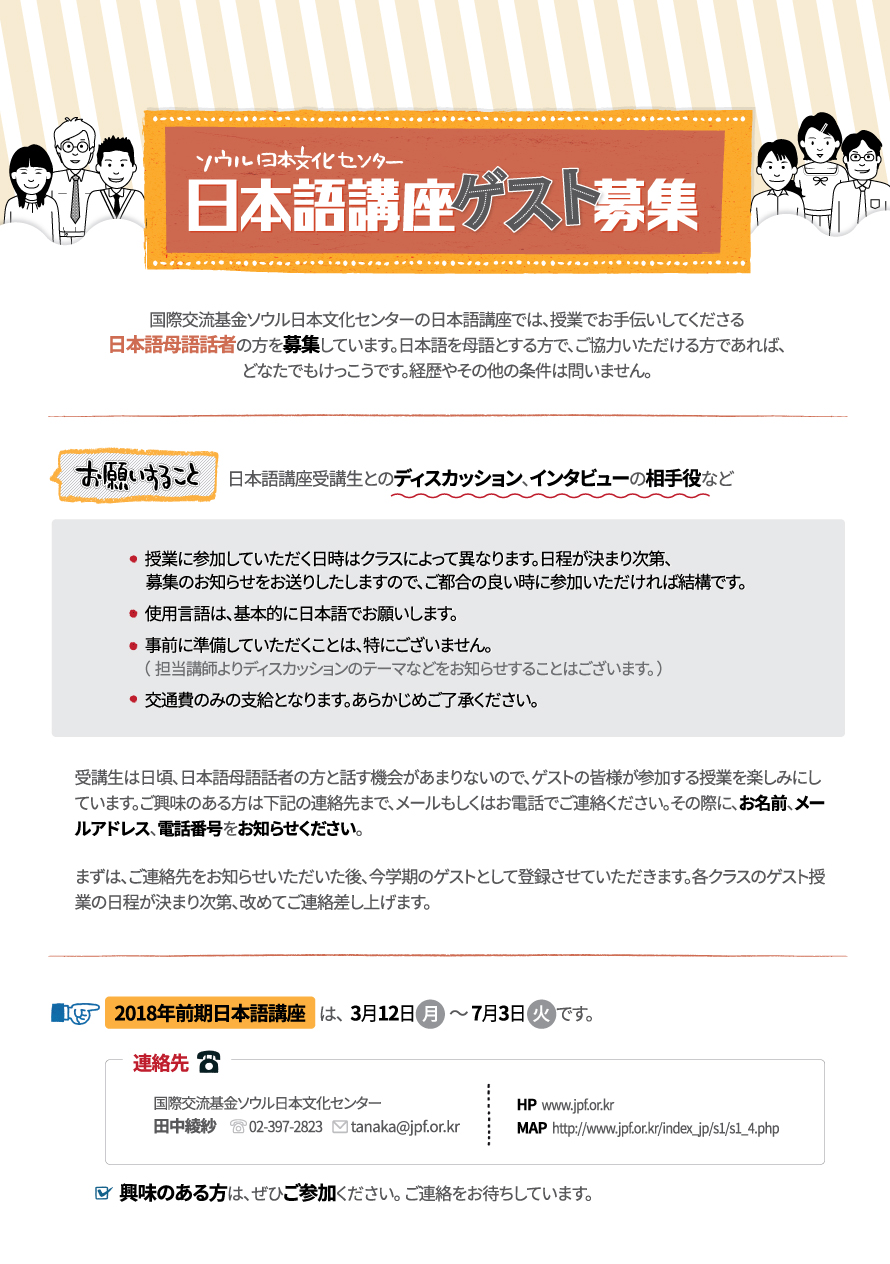 国際交流基金ソウル日本文化センターの日本語講座では、授業でお手伝いしてくださる日本語母語話者の方を募集しています。日本語を母語とする方で、ご協力いただける方であれば、どなたでもけっこうです。経歴やその他の条件は問いません。