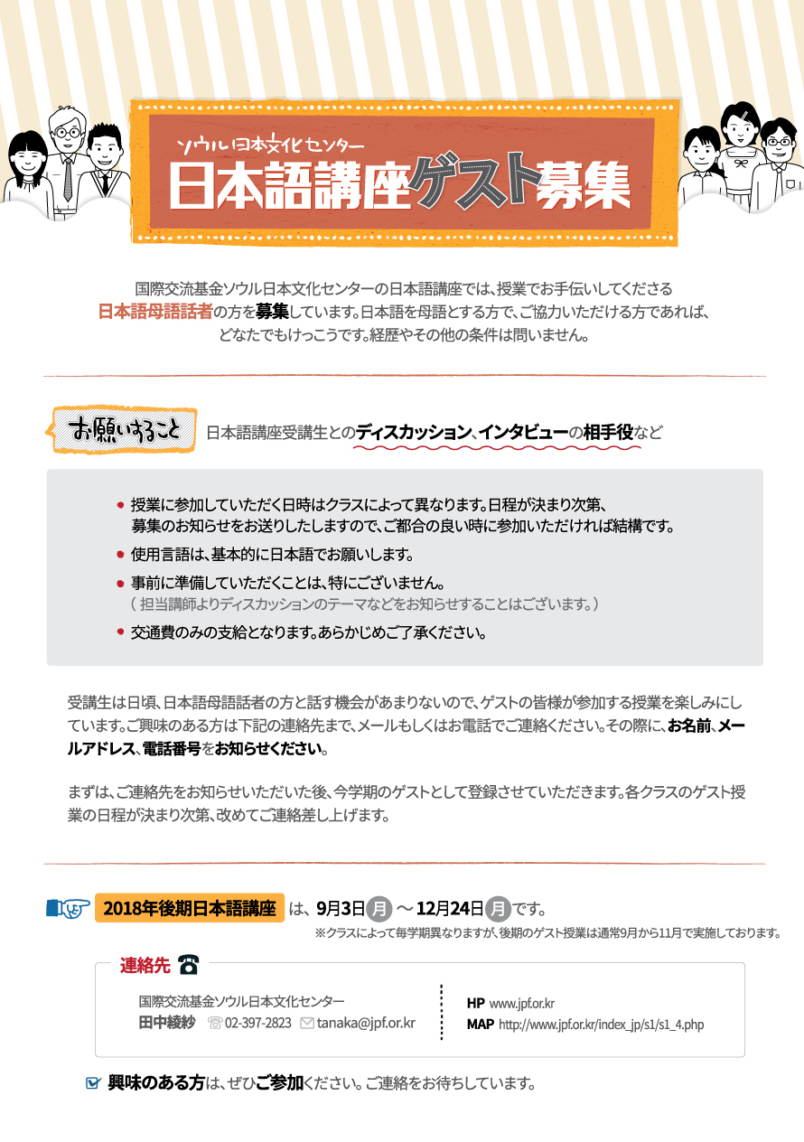 国際交流基金ソウル日本文化センターの日本語講座では、授業でお手伝いしてくださる日本語母語話者の方を募集しています。日本語を母語とする方で、ご協力いただける方であれば、どなたでもけっこうです。経歴やその他の条件は問いません。
