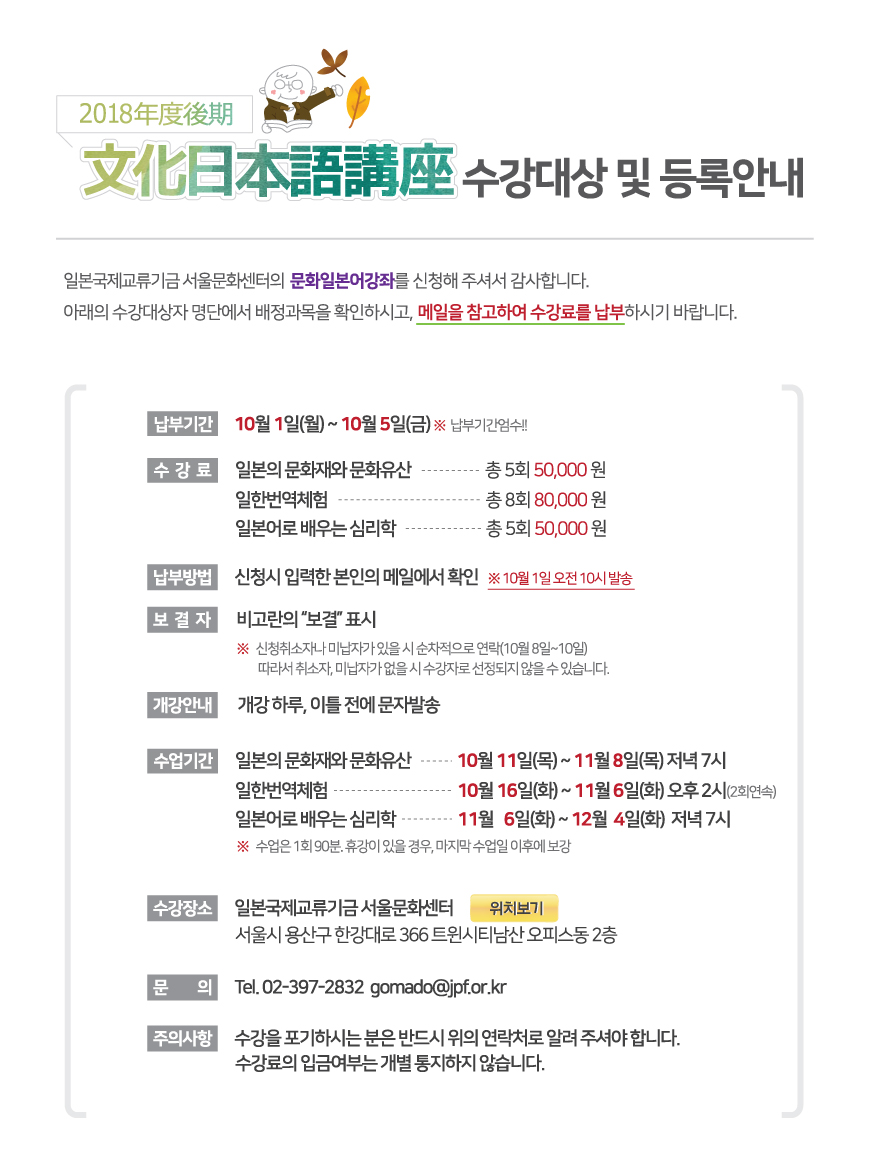 수강대상자명은 가나다순서. "보결"은 취소 또는 미납자가 있을시 연락함