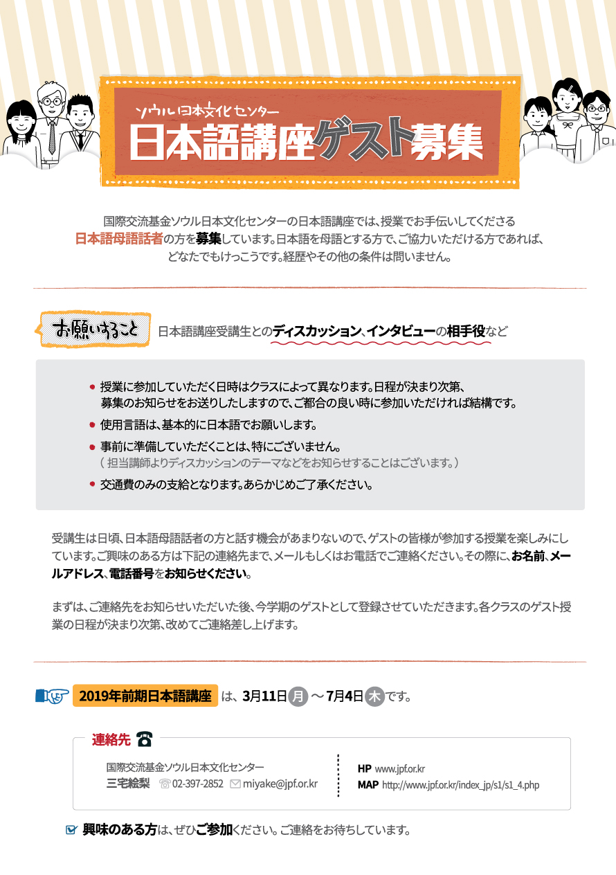 国際交流基金ソウル日本文化センターの日本語講座では、授業でお手伝いしてくださる日本語母語話者の方を募集しています。日本語を母語とする方で、ご協力いただける方であれば、どなたでもけっこうです。経歴やその他の条件は問いません。