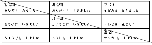 순서) 한다. 2) 질문 방법과 대답의 형식을 예로 제시한다. B:例)映画を見ました。テレビを見ました。 카드 안에 그 내용이 있으면 그 칸에 대답을 한 학생의 이름을 적는다. 4) 빙고카드에서 가로, 세로, 대각선으로 2개의 열을 다 채운 학생은 선생님 앞에 모인다. 가장 빨리 빙고가 된 학생에게 인터뷰결과를 발표하게 하고, 잘한 학생에게는 상품을 준다.