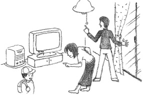 그렇죠, 한 가족이 이제 막 나가려고 하는 참이네요. 대화를 하고 있는 사람은 A가 아버지, B가 어머니일까요? A는 [みんな大丈夫だ(다 괜찮군)]와 같은 남성어를 사용하고 있는 남성, B는 [(~ている) わ((~있네)요)]를 사용하고 있으니까 여성이군요.