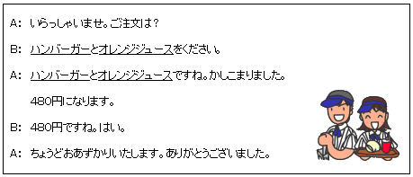 회화문을 짝을 지어 롤플레이를 하는 것으로, 회화 속의 소도구를 바톤 대신에 전달하는 릴레이 게임이다. 여기서는 햄버거 가게에서 이루어지는 회화를 예로 들었다.