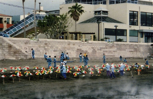 유카타로 갈아입고 해변에 나가 자신이 들어갈 모래 구덩이를 파고 발 끝을 바다로 향하게 하고 타월을 목 위에서부터 얼굴을 가리고 누워있으면 숙소 종업원이 몸 위에 모래를 덮어준다. 그 기분은 한 겨울에 온돌방에서 이불을 쓰고 몸을 지지는 것과 같은 기분이다. 처음에는 그 온도를 잘 느끼지 못하다가 점차 온몸에 열기가 퍼져나가면서 지면에 닿은 신체부위부터 손으로 받치거나 몸에 움직여 열을 분산시켜야 할 정도로 뜨거워진다.아무리 땀을 흘리지 않는 사람이라도 모래 구덩이 속에 10분만 있으면 온몸에 송골송골 땀이 배어나오는 경험을 하게 될 것이다.