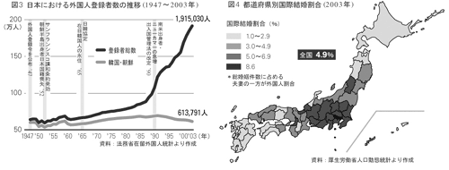 1965년 일본의 국제결혼 비율은 0.4%, 220쌍 중 1쌍이었다. 그러나 1980년대 이후에는 국제결혼이 급증하여 2003년대에는 4.9%, 약 20쌍 중 1쌍 비율로 일본인이 외국인과 결혼하고 있다(표4, 5). 국제결혼 비율이 가장 높은 도쿄의 구에서는 10쌍 중 1쌍이 국제결혼을 하고 있다(표6). 현재는 국제 결혼이 결코 신기한 일이 아니다. 2000년 이후의 연간 일본인의 국제결혼 건수는 35,000명을 넘어섰다. 뿐만 아니라 일본인 남성ㆍ여성의 국제결혼 반려자 상대 국적은 다국적화ㆍ다민족화 되고 있다(표7, 8). 지금까지 국제결혼 건수가 급증한 것은 무슨 이유일까? 그 원인으로 국제결혼 알선이 이루어지고 있는 것을 꼽을 수 있다. 가끔 알선에 의한 위장결혼이 매스컴의 화제가 되는 경우도 있다.