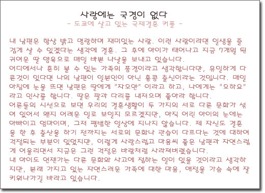 그러나 그러한 경우는 일부에 지나지 않는다. 그렇다면 일본인이 반려자로 외국인을 선택하는 이유는 무엇일까? 그것은 일본인 생활 스타일이 변화하고 있다는 것을 보여주고 있다. 국제인류시대에 외국에서 생활하는 일본인이 많아지면서, 일본은 다민족화 되고 있는 지역사회에 속하게 되었고, 따라서 외국인을 만나는 기회가 결코 드문 일이 아닌 시대가 되었다. 사랑하는 사람이 우연히「일본국적이 아니었다」정도인 것이다(마지막 부분의 '사랑에는 국경이 없다' 참조).
