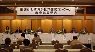 제6회 시즈오카 세계 번역 콩쿠르 심사결과 발표 모습. 결과는 보도발표 외에 본인에게 직접 통보되었고 수상식은 후일에 열렸다.