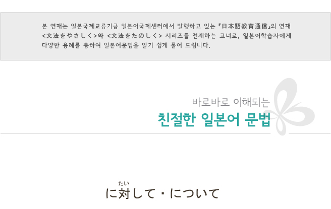 이번 회부터는 한동안 ‘중급수준’의 문법을 배워보도록 하겠습니다. 이번에는 조사상당어(助詞相當語) 혹은 복합격조사(復合格助詞)라고 불리는 ‘に対して’와 ‘について’입니다.