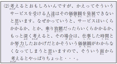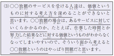 이제 무엇을 말하고자 하는지 잘 전달되는 것 같습니다. (3)은 (1), (2)와 비교해서 몇 가지 다른 점이 있습니다. 밑줄로 표시한 것처럼 ‘~というもの’, ‘~というのは’, ‘~に対する’, ‘~に対して’ 등이 등장하는데 바로 이러한 표현들을 사용함으로써 무엇을 말하고자 하는지가 명확해지고 있습니다. 다시 말해 이러한 표현을 사용함으로써 ‘의견이나 생각을 조리 있게 말할 수 있다’고 할 수 있습니다. 그리고 이러한 문형이나 표현을 배우는 단계가 바로 ‘중급수준’입니다.