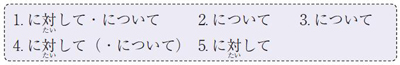 | ‘に対して’: 격조사 ‘に’ + 동사 ‘対する’의 テ형 ‘について’: 격조사 ‘に’ + 동사 ‘付く |