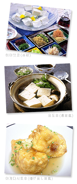 히야얏코(冷奴)는 한자이름에서 알 수 있듯이 차갑고 주로 여름에 먹는다. 차가게 한 두부를 큼직한 사각형으로 썰어 파·가츠오부시·생강 등을 꾸미로 얹고, 마지막으로 간장을 뿌려 먹는다. 여름에 히야얏코가 있다면 겨울에는 유도후(湯豆腐)가 있다. 유도후는 두부, 물, 다시마로만 만들어내는 요리이니만큼 세 가지가 모두 고품질이어야 하니, 에도시대의 요리책『두부백진(豆腐百珍)』에 최상급 요리로 올랐다는 것도 이해할 만하다. 간장·식초·미림·다시물에 다진파, 얇게 선 유자, 무즙을 꾸미로 얹은 소스에 찍어 먹는다. 아게다시토후(揚げ出し豆腐)는 두부에 옷을 입혀 튀긴 다음 소스를 찍어 먹는 요리다. 한국에서는 두부에 옷을 입혀 튀기는 것이 생소하겠지만, 튀김옷 속의 폭신한 두부의 색다른 맛을 즐길 수 있다.